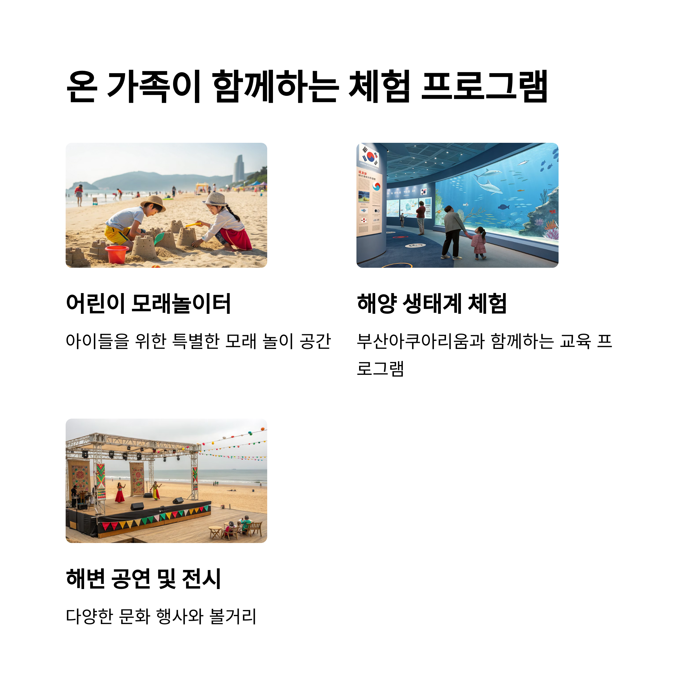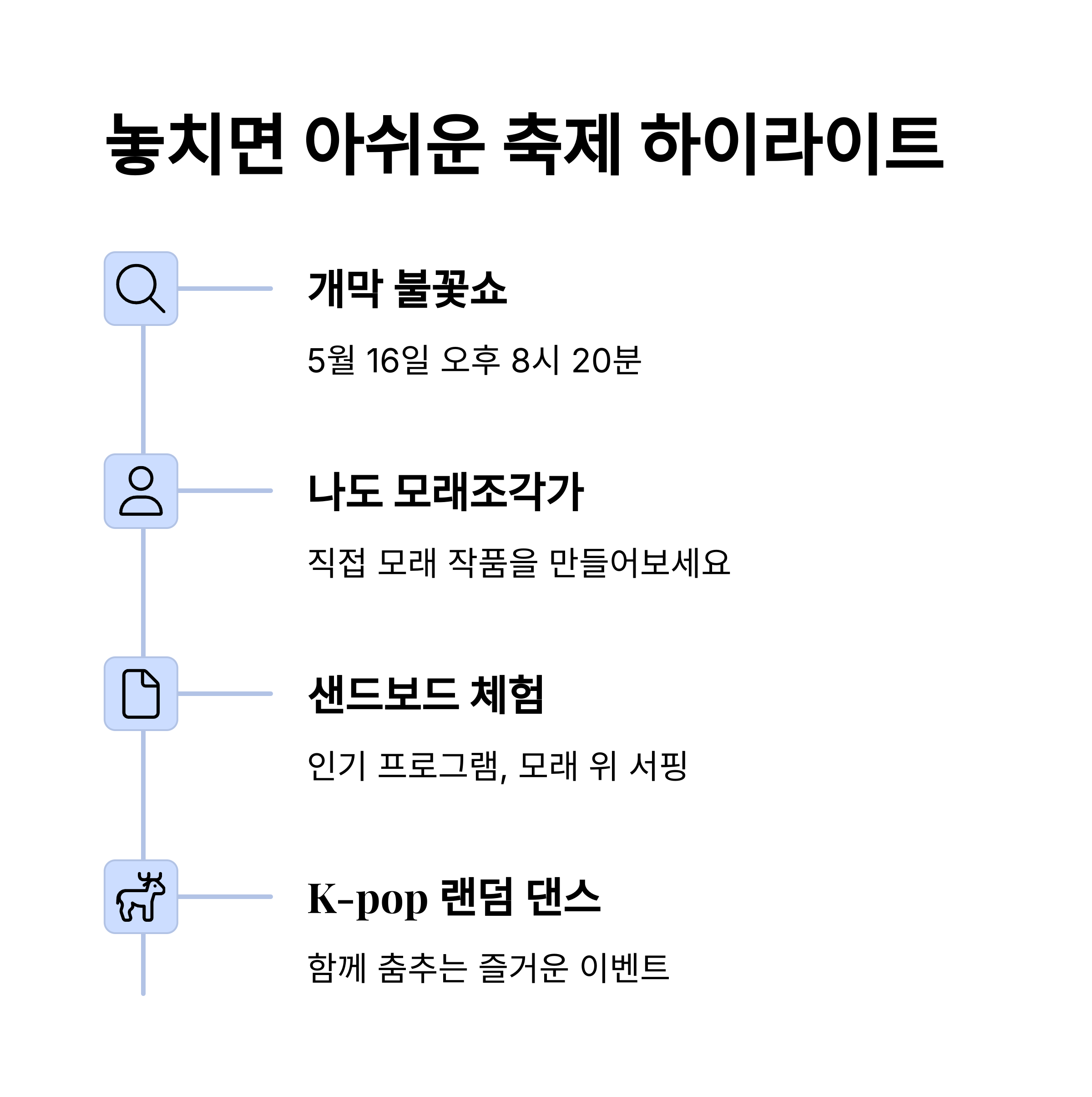 가족과 함께 간다면 ‘모래놀이터’와 ‘도전! 나도 모래조각가’를, 친구들과 즐기려면 ‘K-pop 랜덤 플레이 댄스’, 커플이라면 ‘일몰 시간 모래조각 감상’과 ‘개막 불꽃쇼’를 추천합니다.