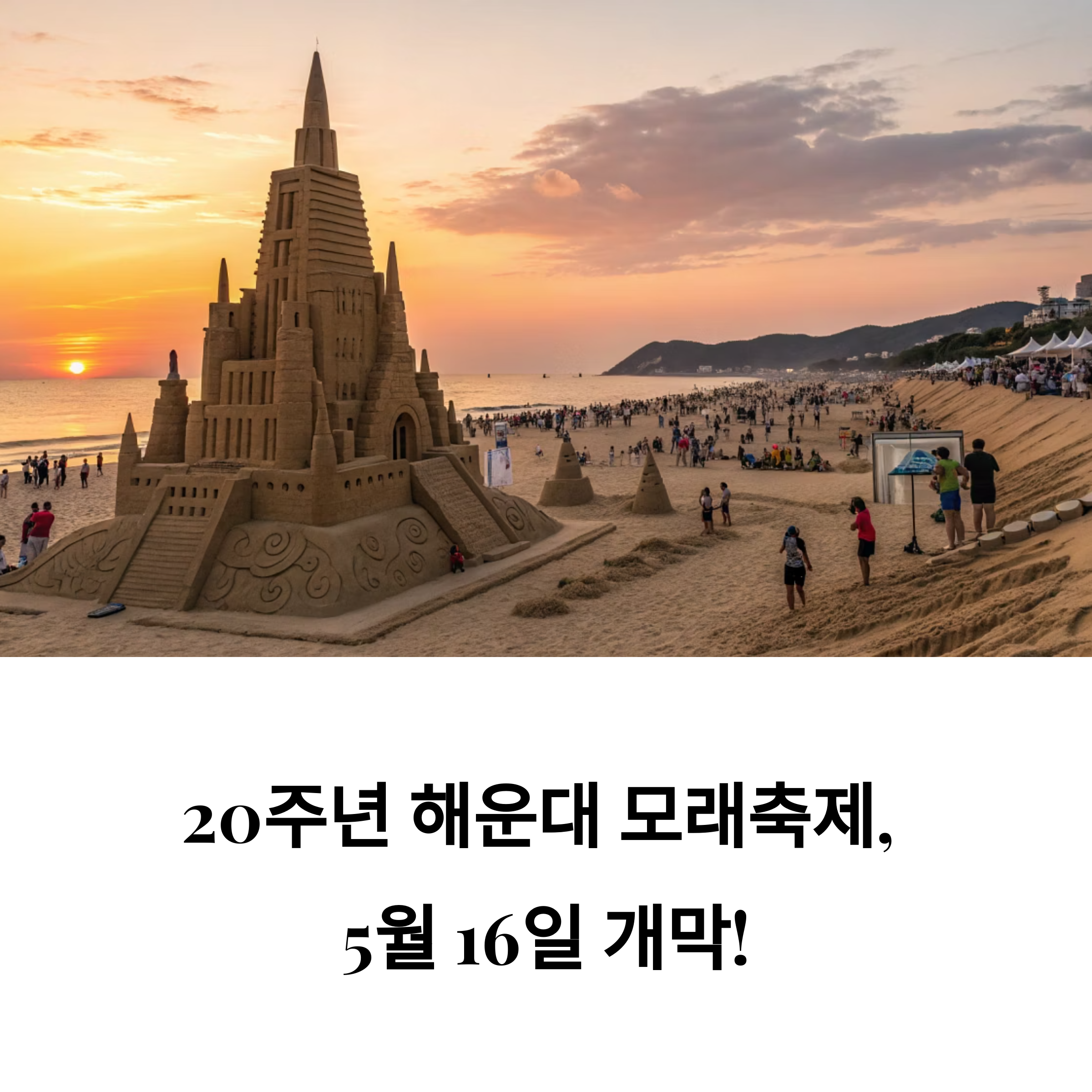 올해로 20주년을 맞는 해운대 모래축제는 '모래로 만나는 K-컬처'라는 주제로 국내외 관광객을 맞이할 준비를 마쳤습니다. 행사 장소는 해운대해수욕장과 구남로 광장 일원이며, 메인 프로그램은 5월 16일부터 19일까지 진행됩니다.