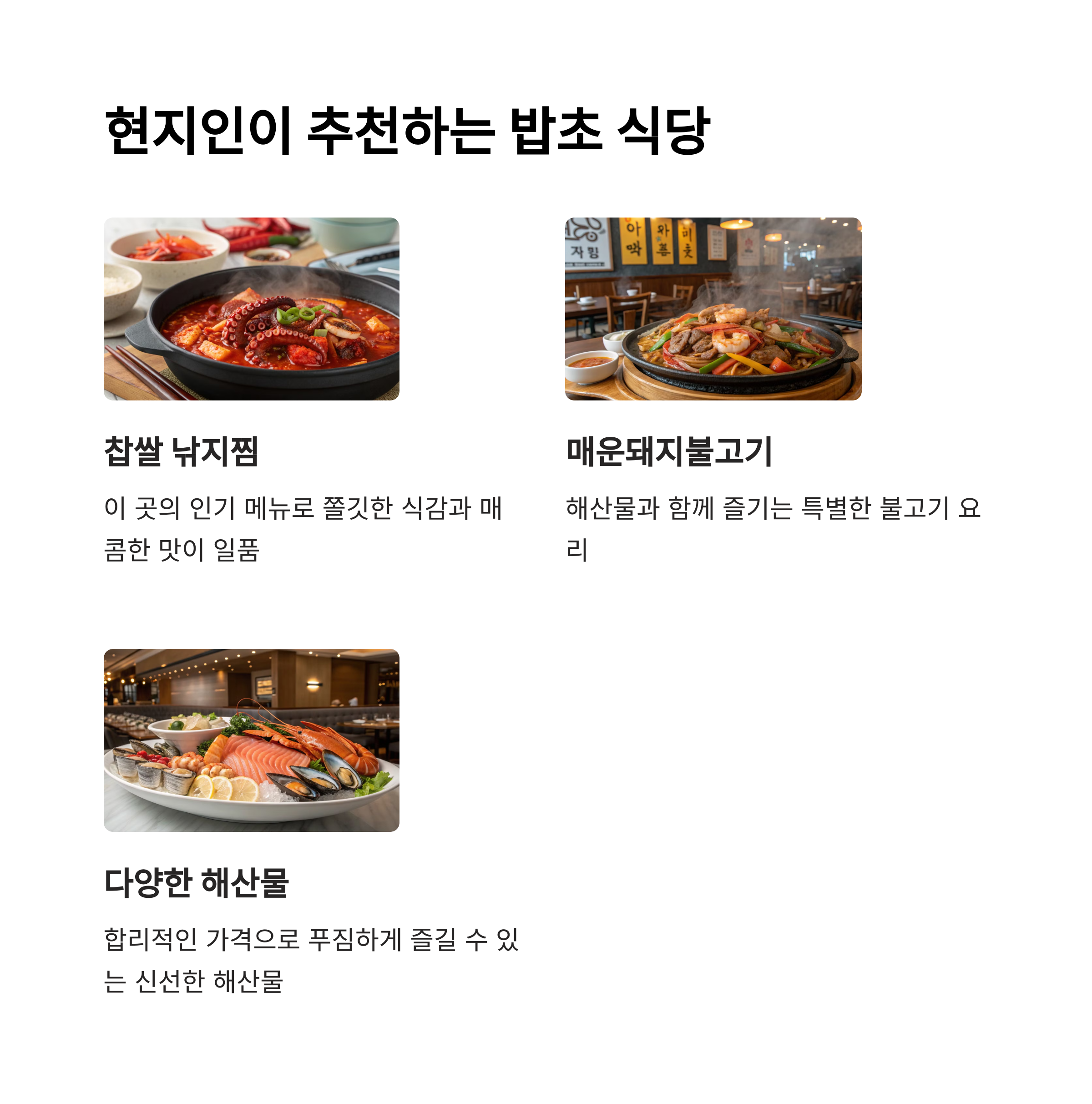| 우럭 맛집 | 데수식당과 밥초 식당에서 신선한 해산물 요리를 맛볼 수 있음 |