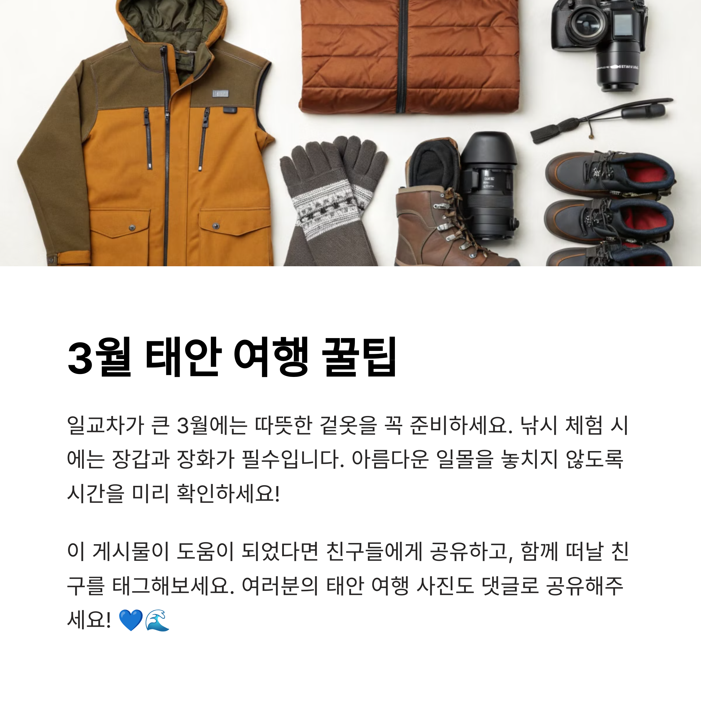 태안에서의 여행 경험이 있으신가요? 추천하고 싶은 맛집이나 여행 코스가 있다면 댓글로 남겨주세요!