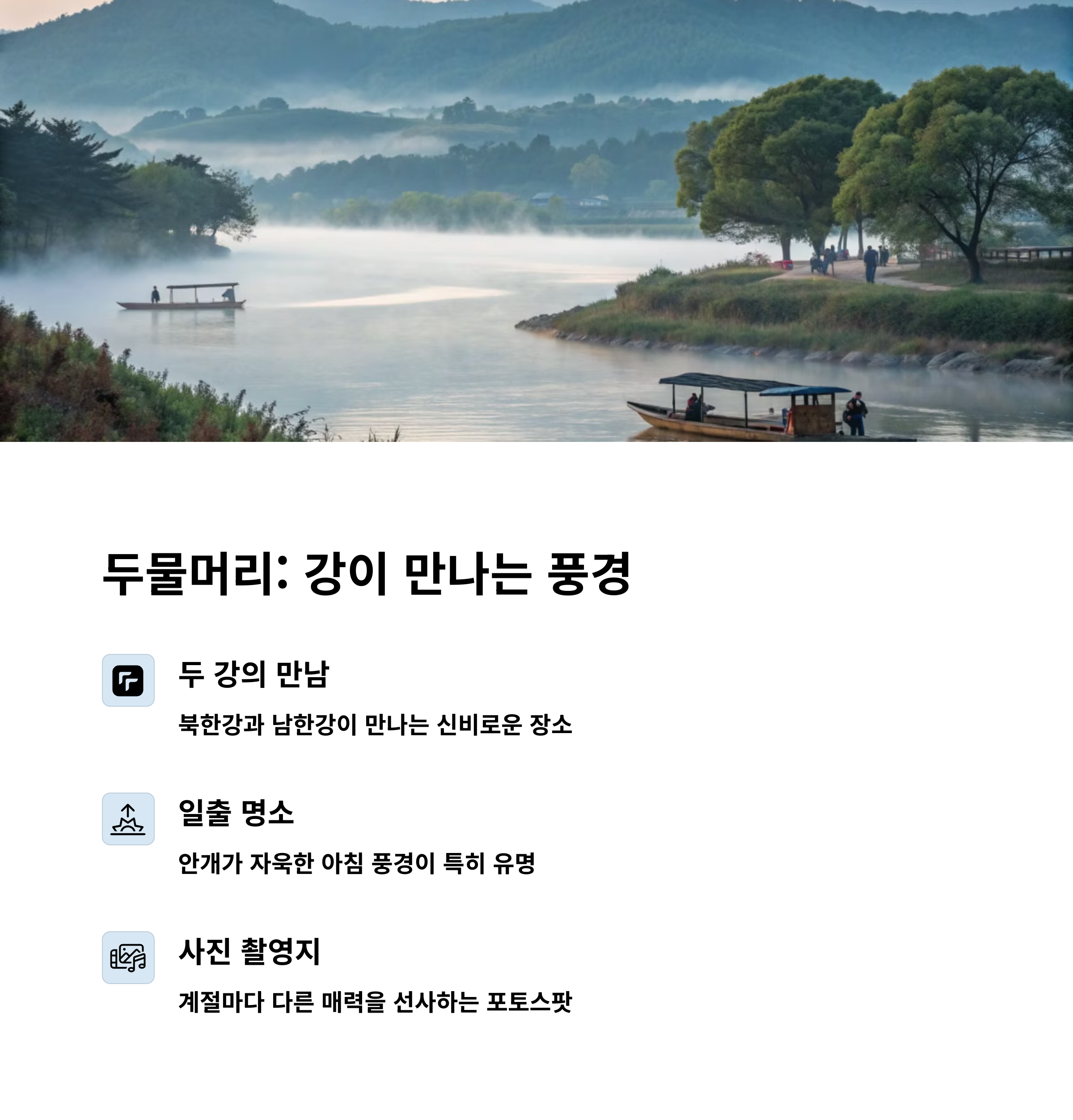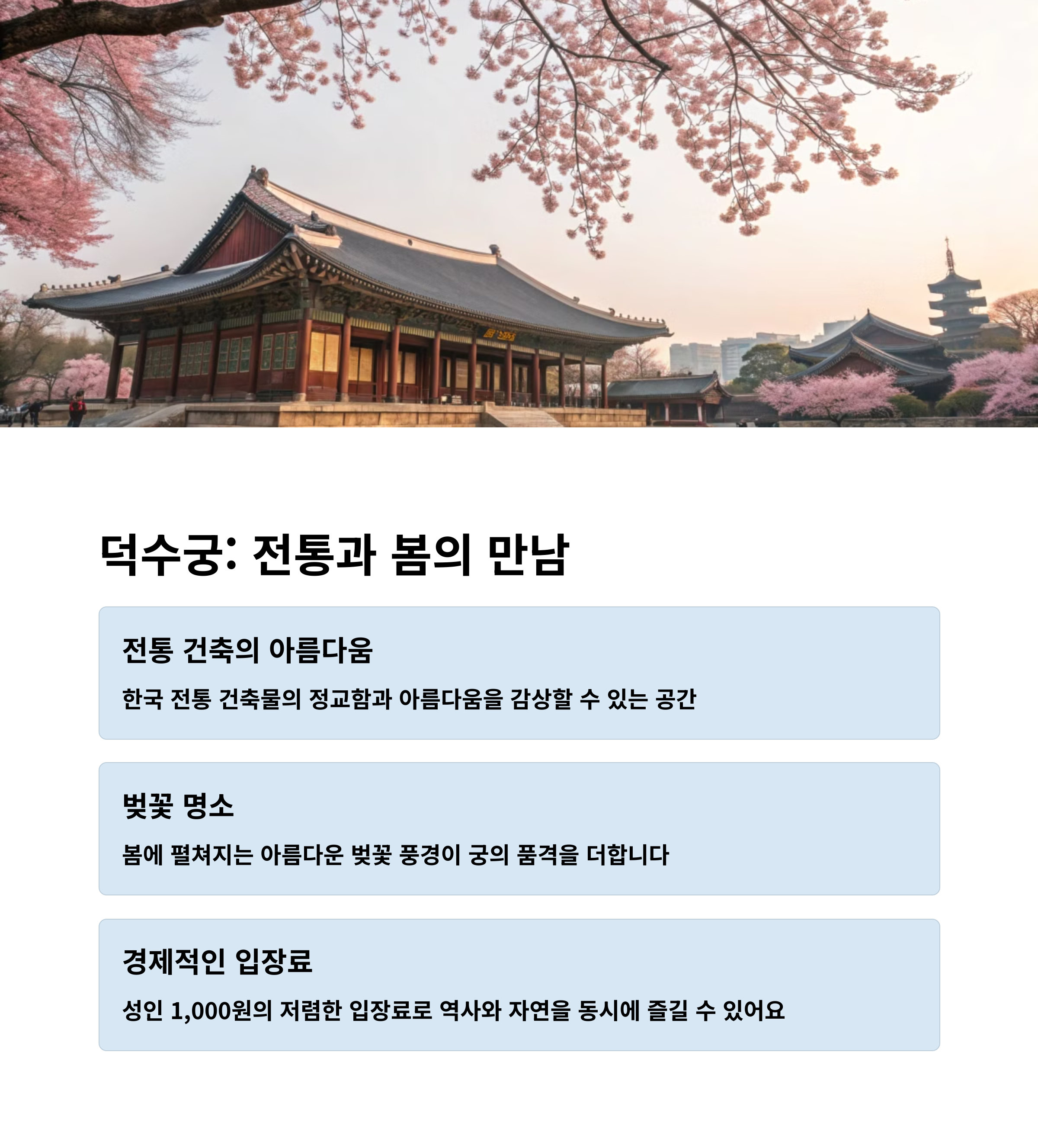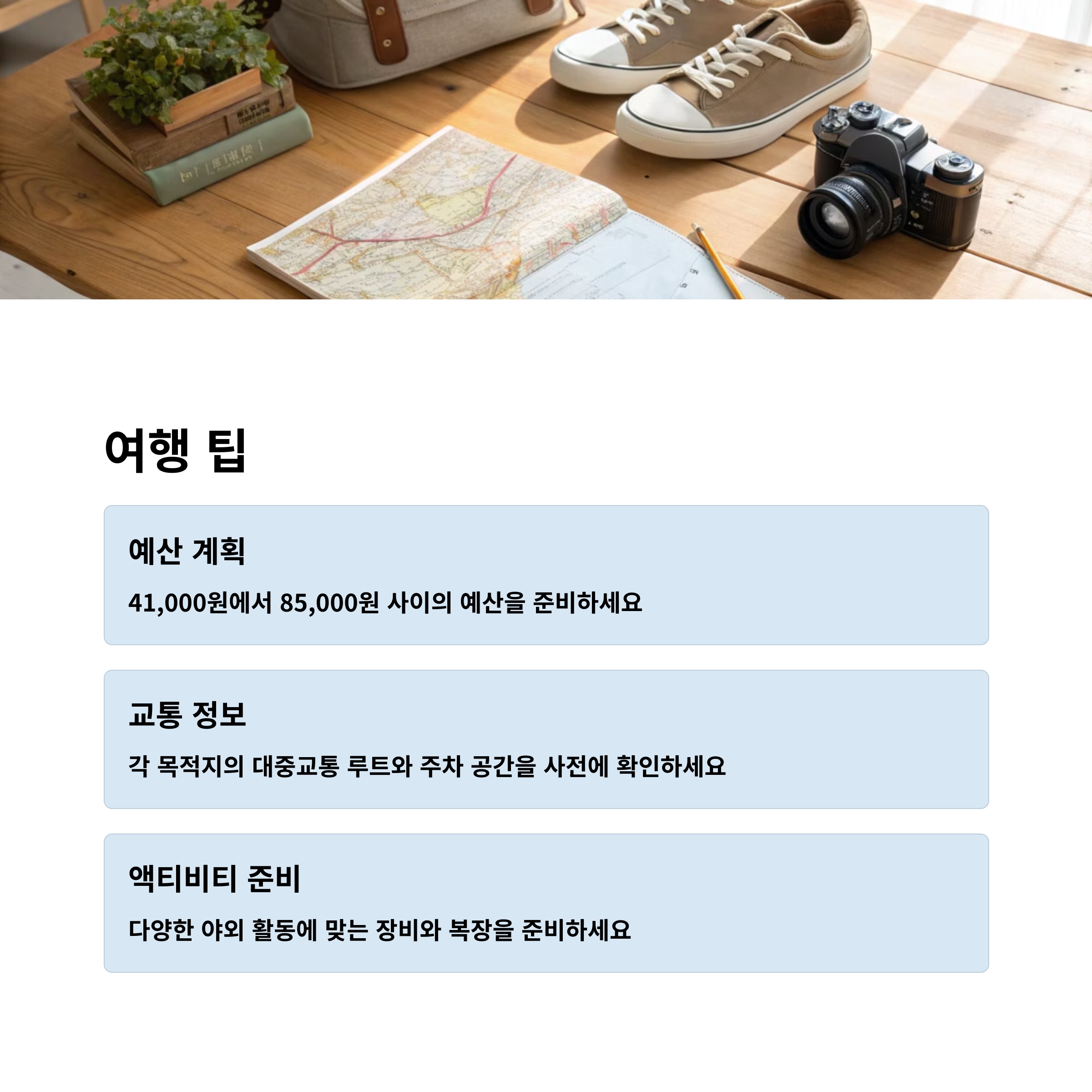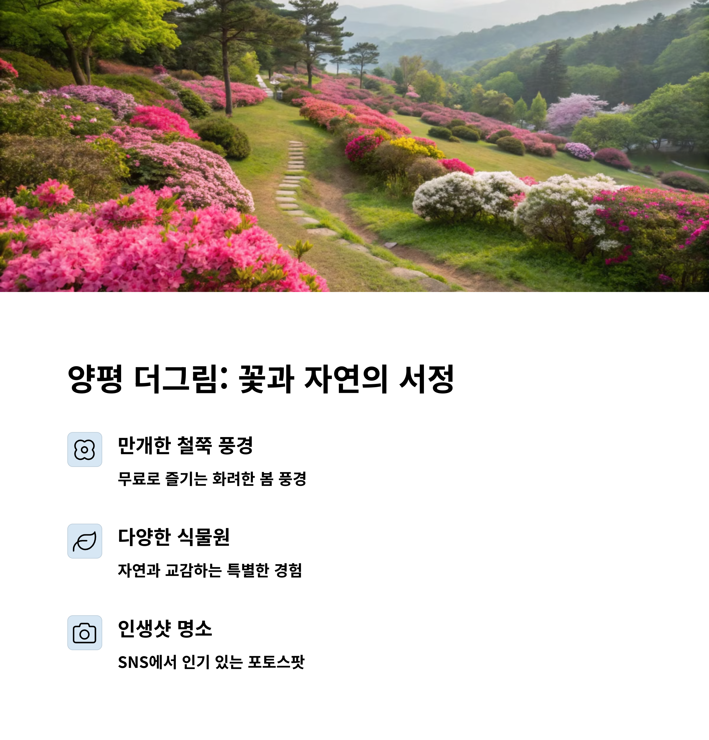여행지 선택 팁: 이동 시간과 목적에 맞춰 선택해보세요. 꽃구경과 자연 산책을 원한다면 양평 더그림, 전통문화가 좋다면 덕수궁, 액티비티를 원한다면 북한산을 추천해요!