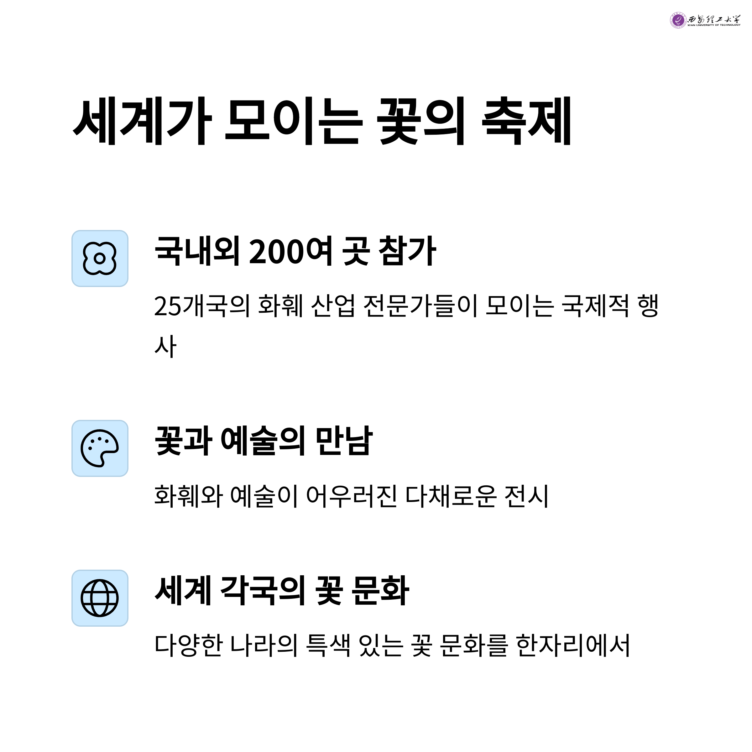 꽃만 구경하고 돌아오긴 아쉽죠. 꽃꽂이, 화환 만들기, 가드닝 워크숍까지 체험 프로그램도 다양합니다. 아이들과 함께하는 가족 관람객에게는 최고의 코스가 될 거예요.